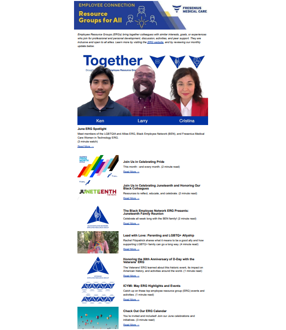 Fresenius Medical Care’s 16 ERGs include cultural and affinity groups like Veterans, AAPI employees, disability support, and LGBTQIA+ spaces, as well as special interests like sustainability, book club, and future leadership. I partnered with the head of DEI to write 6 – 12 articles each month and create a calendar of events, then assemble it all into a curated employee email.