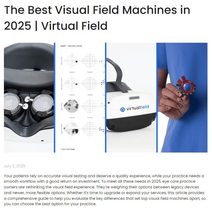 Comprehensive eye exams used to include bulky tabletop perimetry, but optometry and ophthalmology are changing fast. VR headsets are now an accessible, comfortable option for conducting accurate visual field exams. Marketing this device, along with its proprietary algorithm to assess eye health over time, is not as simple as leaning into branding or legacy status. Virtual Field is the first of its kind, but it remains a relative newcomer in eye health, so developing content means building up buy-in and establishing authority.